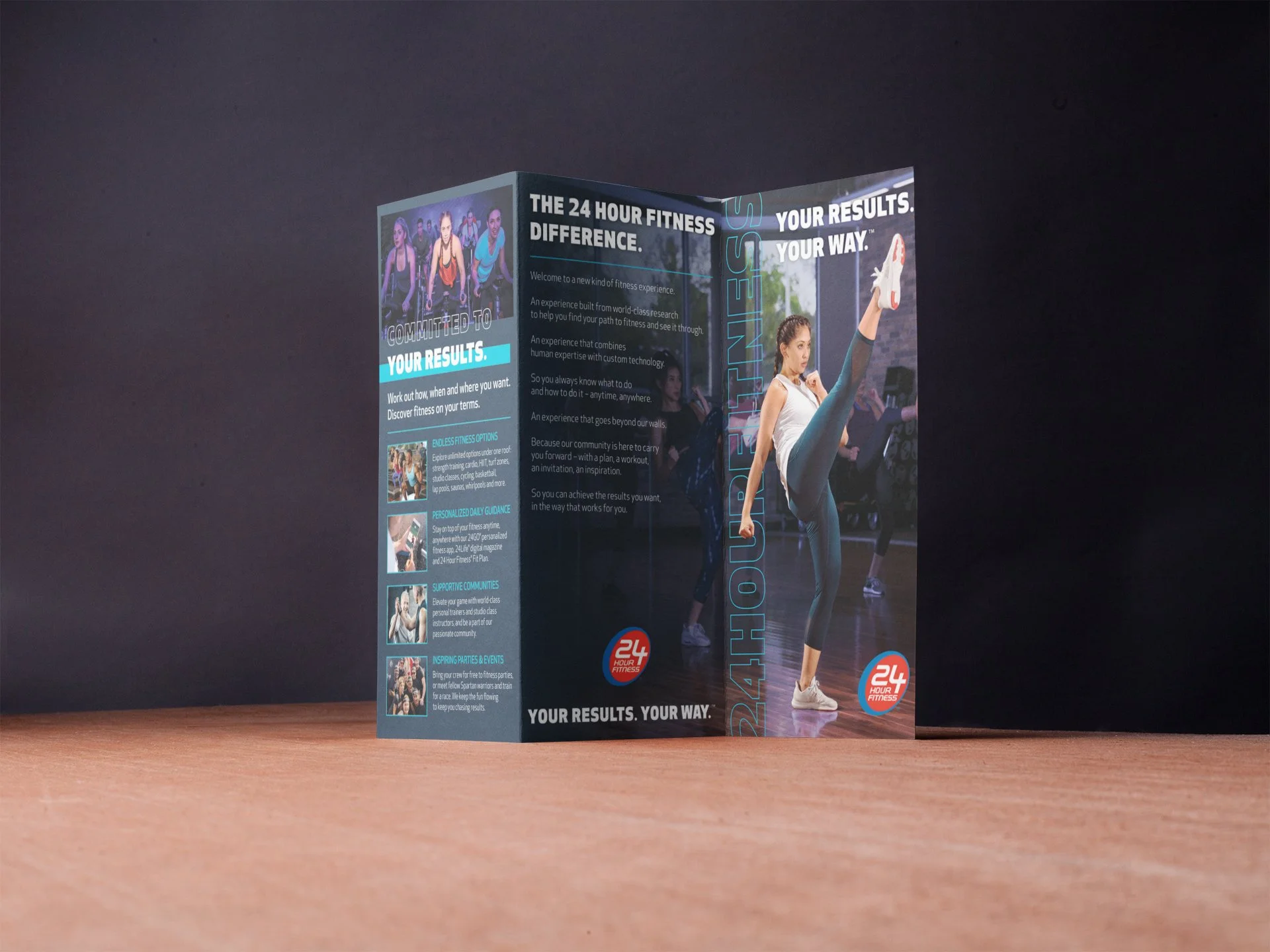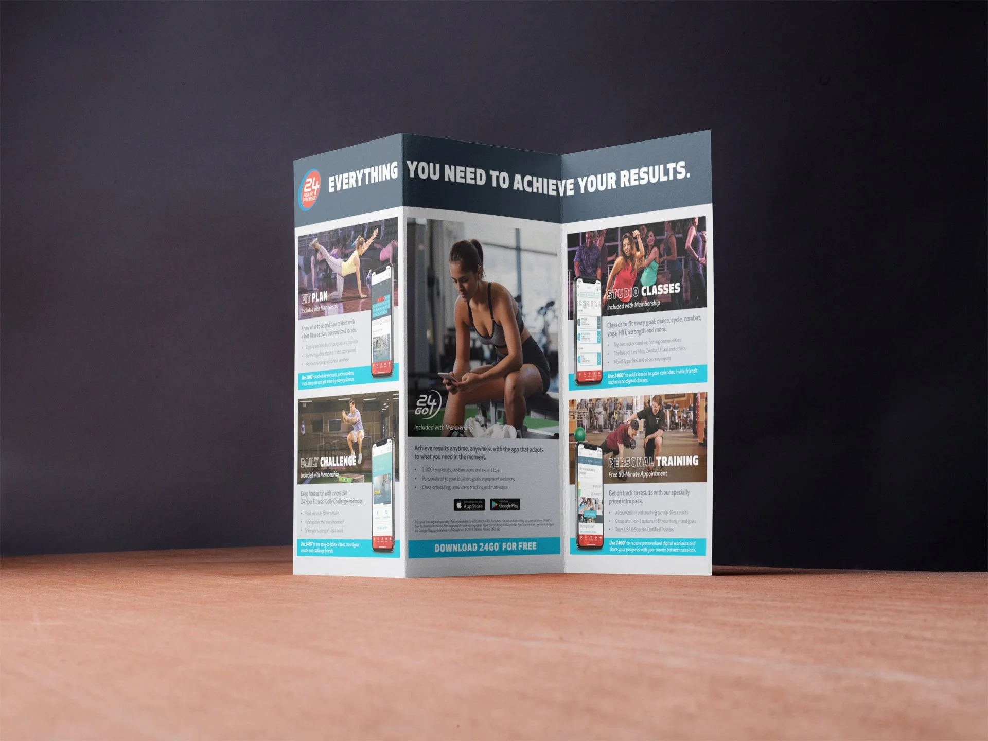 I designed this tri-fold brochure to highlight all of the amenities 24 Hour Fitness has to offer, it was available in all clubs. This was a new design direction that was well received and carried over to many other assets.